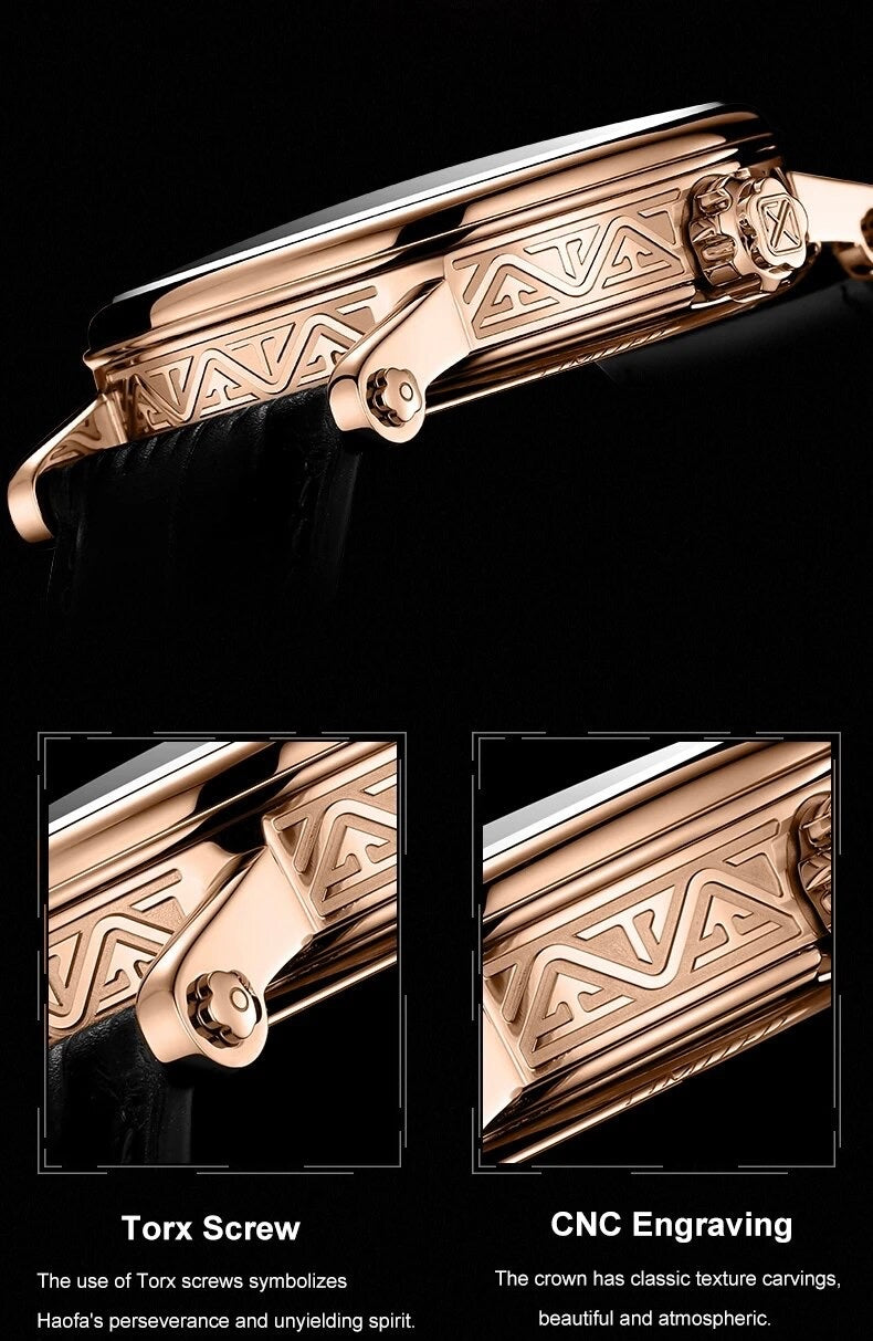 [Luxury Craftsmanship] The case, meticulously crafted from 316 stainless steel, undergoes a CNC engraving process featuring a three-dimensional relief design. The polished outer layer and frosted inner layer showcase the artistry of Haofa's case craftsmanship.