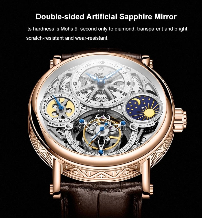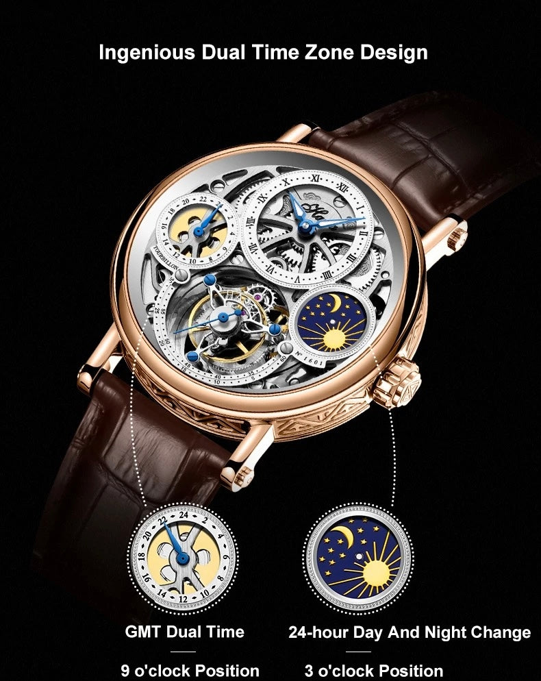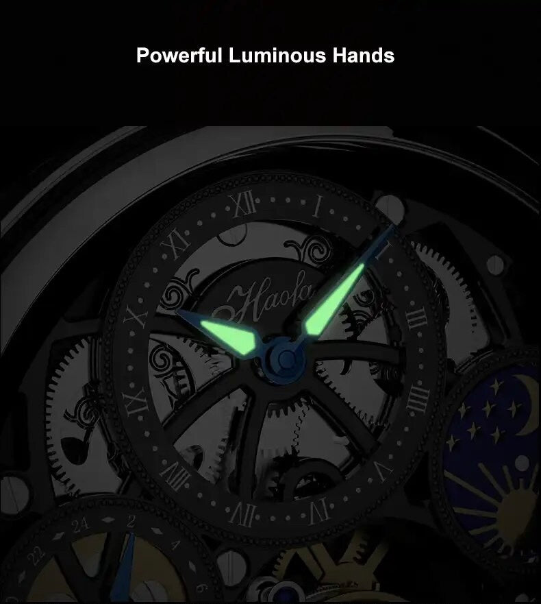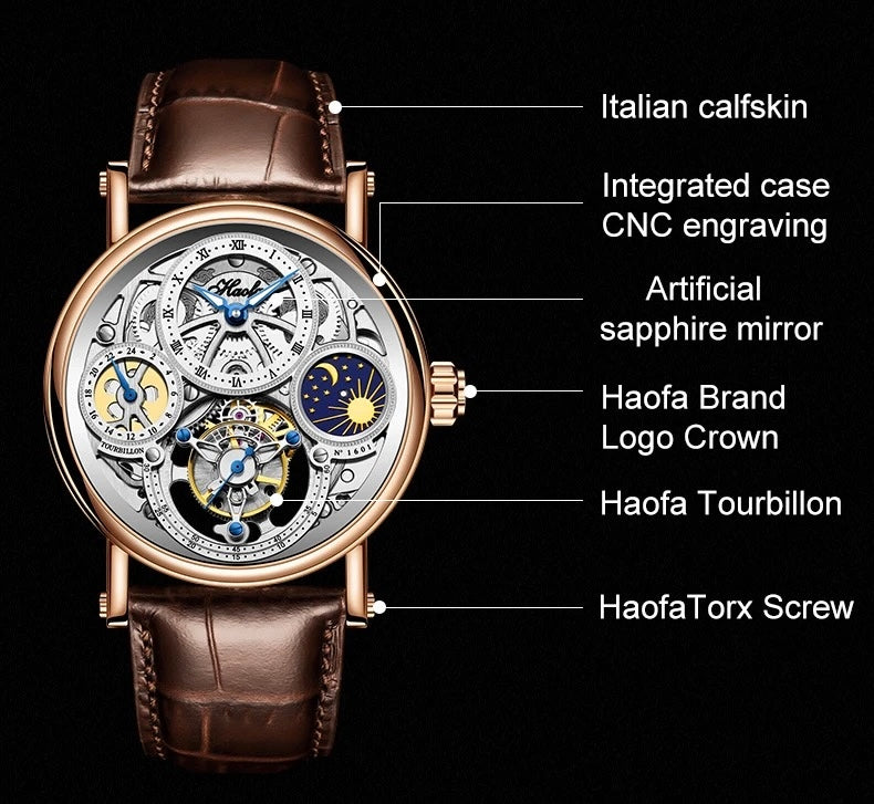 Indulge in the artistry of time with the Haofa™ Skeleton GMT Tourbillon - where every detail tells a story of craftsmanship, innovation, and timeless elegance. This watch is not just a timepiece; it's an expression of your appreciation for the extraordinary. Order now and become a part of a select few who own this horological masterpiece.