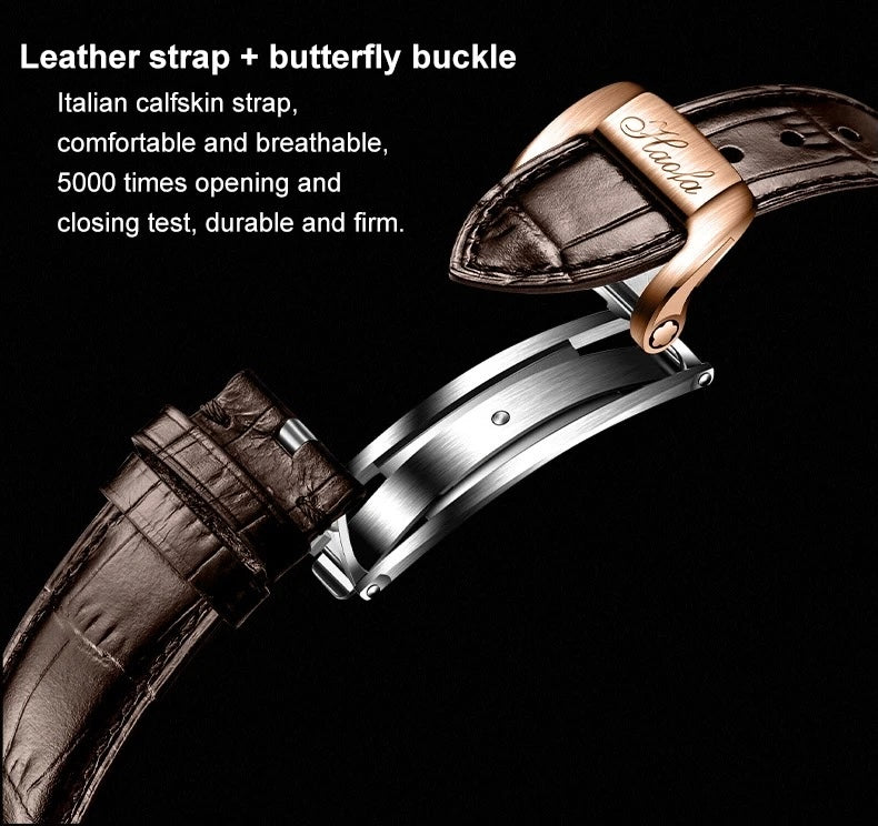 [Italian Calfskin Leather Strap] The watch embraces your wrist with a luxurious Italian calfskin leather strap secured by a butterfly buckle. Enduring 5000 times of opening and closing tests, it offers comfort, breathability, and durability.