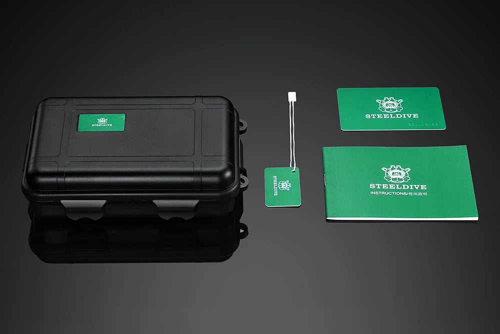 Your Steeldive 300M comes in a dive watch box, complete with a tag, warranty card, and manual, ensuring you have everything you need for your underwater adventures.